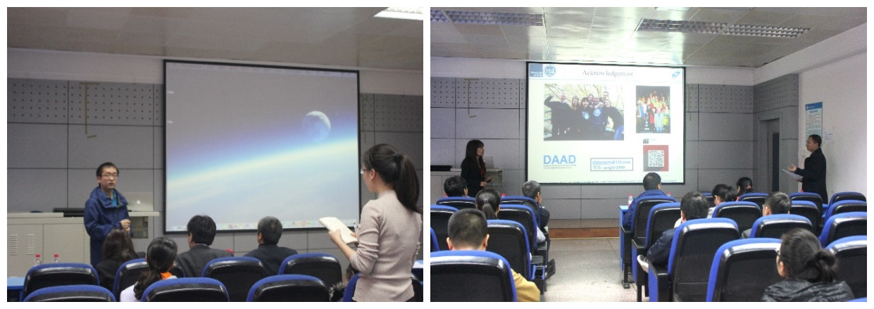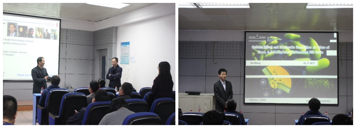 上午10-12点在研究生西馆XA208会议室举行了留德青年学者学术报告会,报告会由陈强副教授主持,yl7703永利集团部分教师、博士级硕士研究参加。首先是梁玉仓博士做了题为“周期性有序的介孔有机硅材料的合成及应用”,梁博士深入浅出,用通俗易懂的语言向大家解释了介孔硅材料的化学合成,对介孔硅材料在生物医学领域的应用前景与我院师生开展了热烈的讨论。德国明斯特大学的王达博士向大家介绍了“4,5-二烷基咪唑卡宾盐的结构特征及细胞毒性”,德国科隆大学的宋琳博士学术报告关于“Strumpellin的功能和N471D位点突变对HSP的影响”,德国埃朗根—纽伦堡大学的郑凯博士就纳米生物活性玻璃在组织修复中的应用做了相关介绍。两个多小时的报告会气氛热烈,老师和同学们都收获良多。