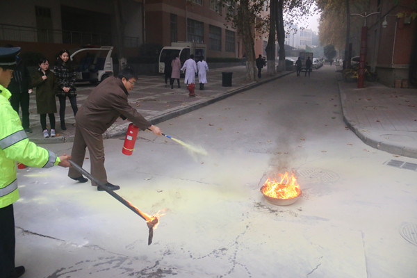 演练前,学院办公室工作人员对疏散路线及各个安全出口进行仔细检查,消除障碍和隐患,确保线路畅通和安全。上午10点,消防警报响起。全院150余名师生用毛巾捂住口鼻,按照紧急疏散路线有序的快速撤离,从三个疏散门撤离至学院楼北侧安全地带,整个过程仅用了短短2分30秒。经演习工作人员对楼内房间逐一检查,无一师生滞留在“火警区”。仓怀兴院长在总结讲话中指出此次演习落实了学院应对突发事件的防范措施,提高了学院处置突发事件的能力。他强调,安全无小事,全院师生应高度重视消防安全,提高安全意识,把消防安全工作放在重要位置,将安全工作常规化、制度化。随后,学校保卫处消防办郑活勃老师针对演练中出现的问题给在场师生进行实地讲解,为师生讲解了消防常识,并演示了灭火器的使用方法。在认真听讲和仔细观摩过后,现场的教师和学生实际操作灭火器实施了灭火演练。