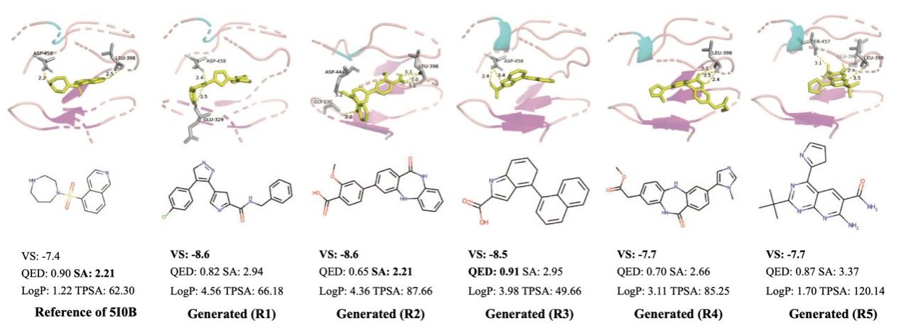 选择PID为 5I0B的蛋白质进行案例研究,该蛋白突变在多种肿瘤问题中被检测到。在运行CProMG-VQS后,根据VS选择了它的前5个生成分子,并应用RDKit计算它们的QED、SA、LogP和TPSA值(图2)。结果显示每个分子都满足QED ≥ 0.6,SA≤ 4.0,而其LogP和TPSA符合RO5。这表明所生成的化合物易于合成并且具有良好的类药物性质。且生成分子与参考分子的相似性较低,表明生成的分子是新颖的。