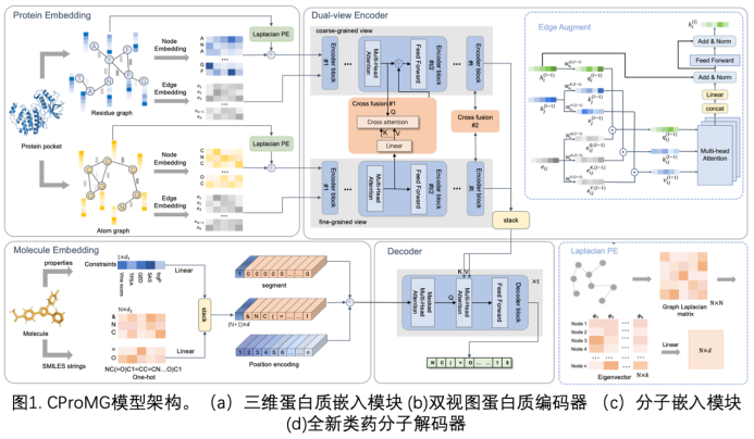 为了解决这些问题,本文提出了一个在所需类药属性控制下进行分子生成的蛋白质导向生成框架CProMG,包含一个三维蛋白质嵌入模块、一个双视图蛋白质编码器、一个分子嵌入模块和一个新型类药物分子解码器(图1)。基于融合蛋白质层次结构的想法,CProMG通过将蛋白质氨基酸结构与原子结构的特征融合,显著增强了蛋白质结合口袋的表现力。通过联合嵌入分子的SMILES序列、类药物性质和与蛋白质的结合亲和力,使用多头交互注意力块计算分子字符与蛋白质残基和原子的接近程度,从而可以捕捉蛋白质口袋和分子之间的关键相互作用,最终以可控的方式自回归生成具有特定性质的新分子。
