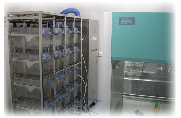 SPF/清洁动物实验室面积约40平方米,分为前室、SPF动物实验室、清洁动物实验室、清洁动物饲养观察间、清洁饲料储藏室,洁净度为万级。SPF动物实验室设独立送风式无菌动物笼架(IVC),笼内洁净度为百级,与外界隔离,可以最大限度的杜绝动物的感染及交叉感染。清洁动物饲养观察间可以通过监视系统对饲养的实验动物的行为进行观察。