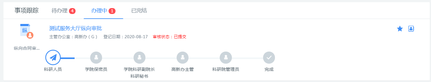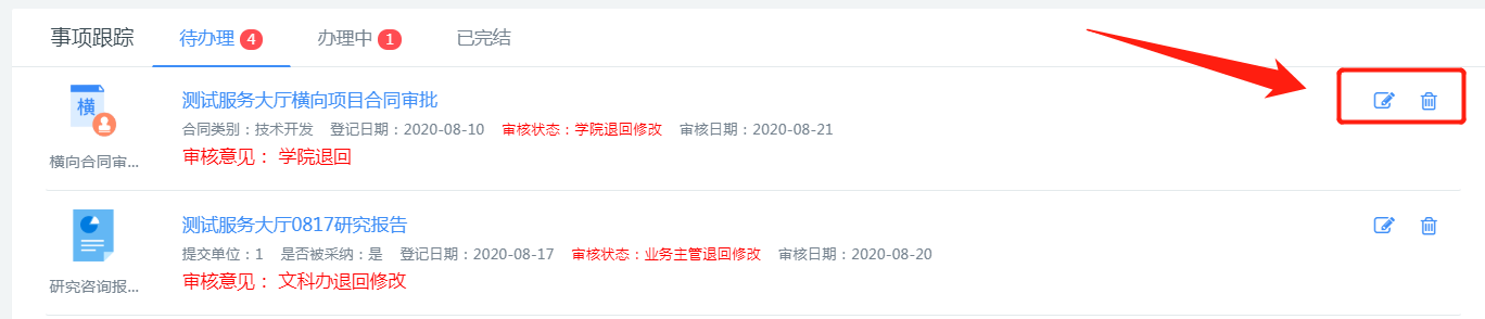三、在“事项跟踪”栏可查看待办事项,包括暂存、退回、待用印、待立项等,请根据提示信息进行线上操作(编辑或删除)或线下业务办理(用印、合同备案等)。