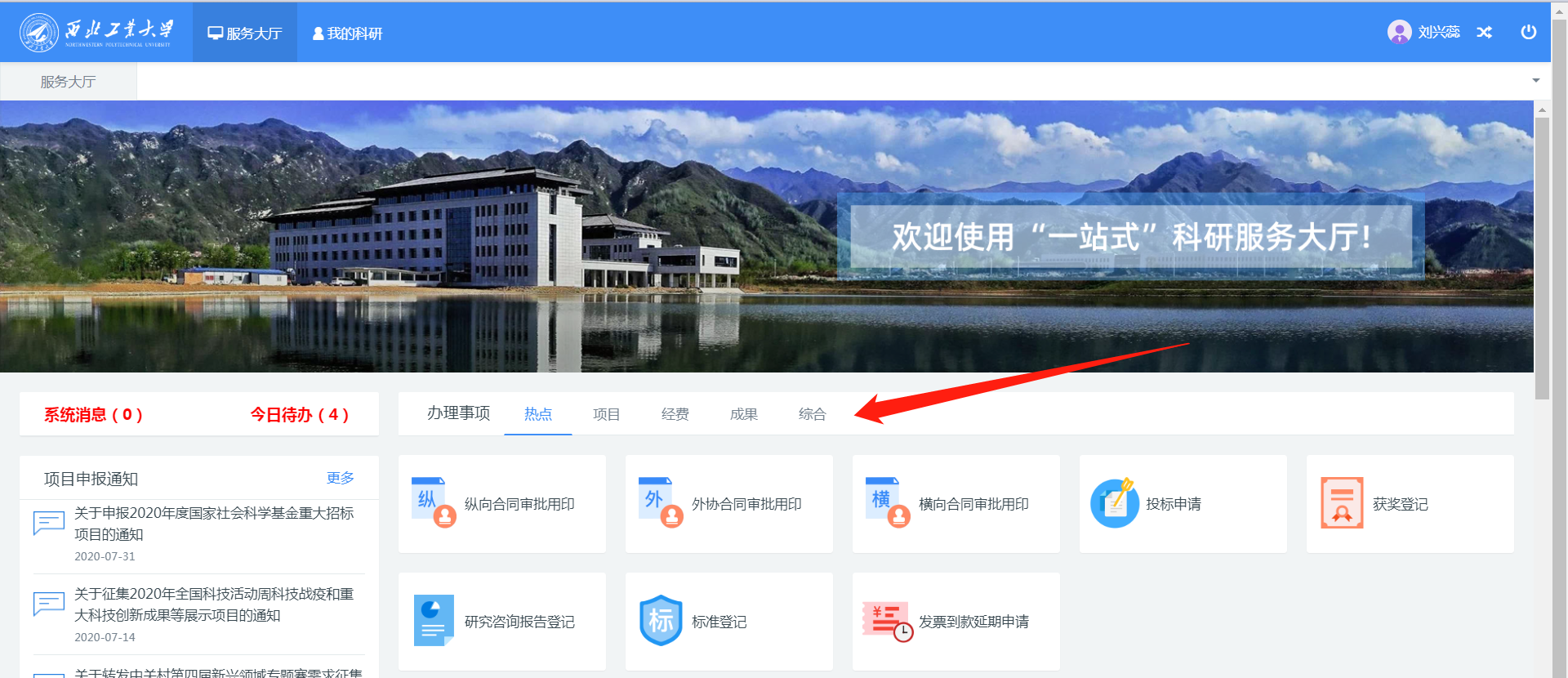 为了方便教师通过科研信息系统在线办理各类科研业务,“一站式”科研服务大厅已完成建设并于2020年8月25日起上线试运行,教师可通过服务大厅快速新增业务、查看办理流程、跟踪流程进度、获取项目申报通知、查询个人科研详情。使用说明如下: