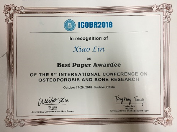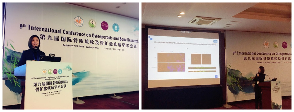 本次会议共收到599篇投稿征文,其中44篇进行口头发言交流,19篇获优秀论文奖。蔺枭讲师所投会议论文“Microtubule actin crosslinking factor 1 (MACF1) positively controls osteoclastogenesis by regulating cell migration and fusion”获得了口头汇报资格,并获优秀论文奖,充分说明本研究室的课题具有很好的学术前瞻性和研究前景。另外,蔺枭讲师还对本课题组的研究团队和研究方向进行了介绍,欢迎国内外专家学者与本课题组进行学术交流及合作,引起了众多专家学者的关注,在会议中与各位专家、学者围绕骨质疏松和骨矿盐疾病研究进行了充分的交流,获益良多,为后续合作奠定了基础。(文/图:肖云云;审核/骞爱荣、马西平)