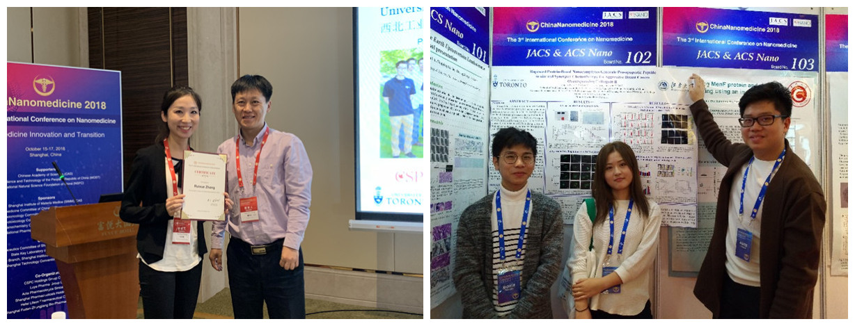 图左:在纳米药物诊疗青年分会场,南京工业大学先进材料研究院董晓臣教授授予张瑞雪副教授证书;图右:在以美国化学会JACS/ACS Nano冠名的墙报展示中,潘震宏、张倩蓉、和刘君鸿三名学生为参会人员介绍以菜籽蛋白为纳米材料治疗癌症的研究成果(海报编号:P102)。