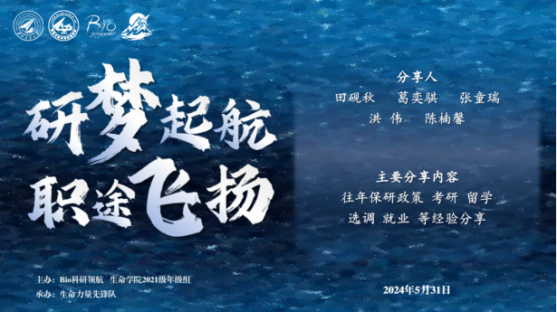 为加强学生未来职业规划意识,提升总体升学就业质量,“研梦起航·职途飞扬”升学就业经验分享会于5月31日晚线上线下同时进行。该活动由yl7703永利集团2021级年级组、Bio科研领航学生团队主办,生命力量先锋队负责承办。活动邀请了田砚秋等6名同学,分别围绕往年保研政策、考研经验、留学申请、选调信息及准备等方面进行分享交流。yl7703永利集团辅导员任磊旗、yl7703永利集团和生态环境学院学生参加了本次分享会。