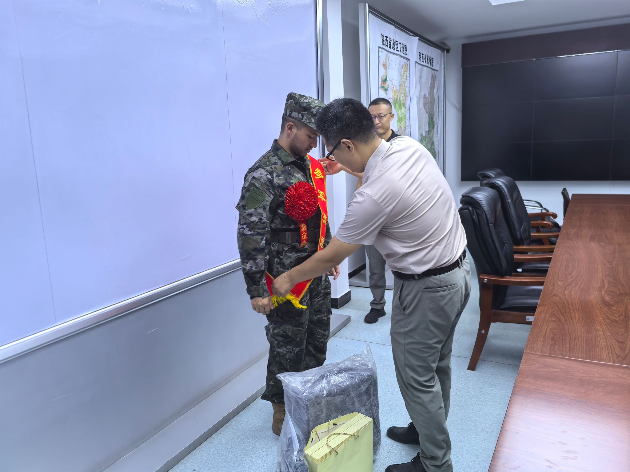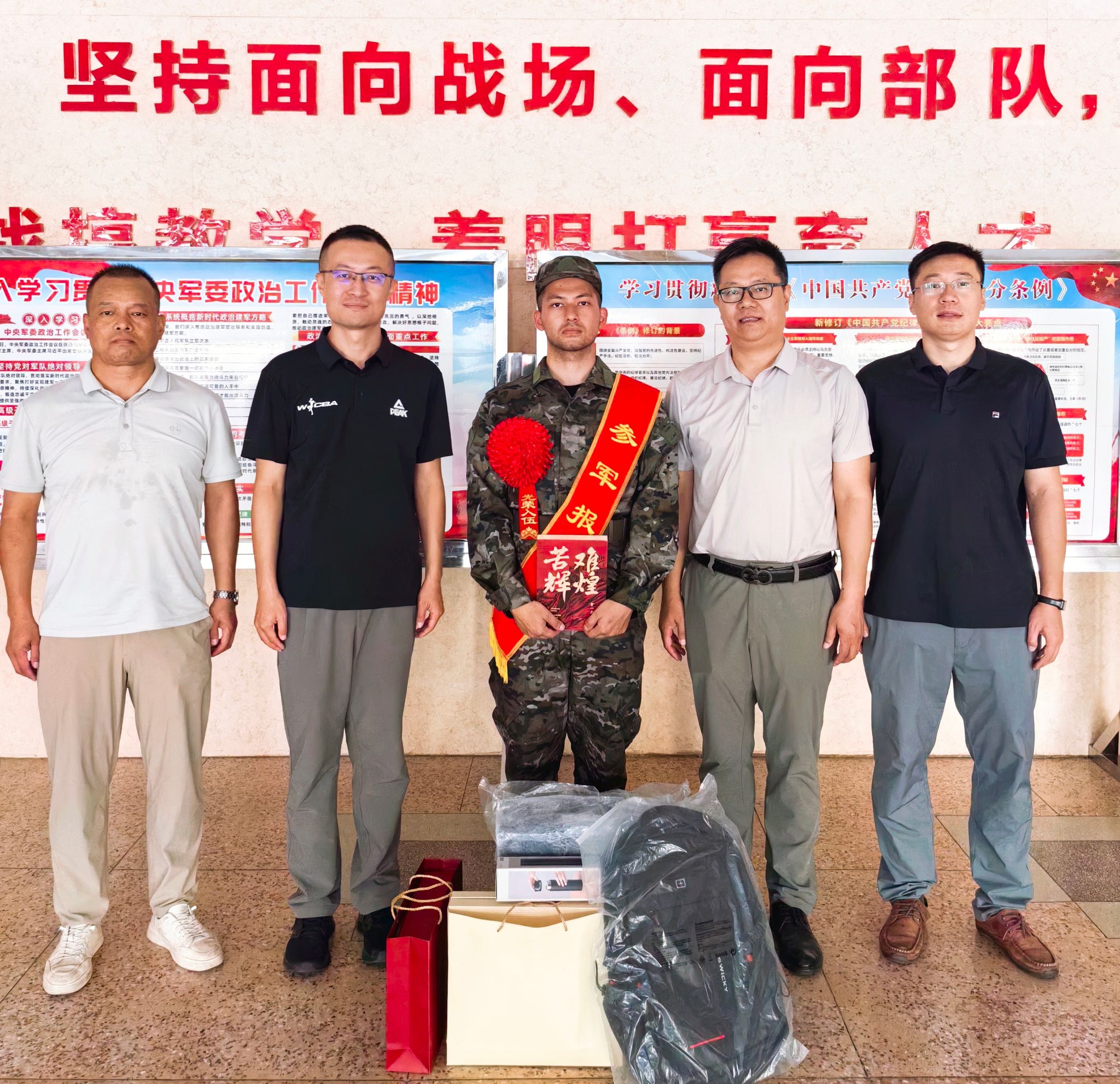 9月15日上午,2025年下半年碑林区欢送入伍新兵暨全民国防教育活动在某预定新兵役前教育基地举行。生命科学与医学学部党委副书记万海东、辅导员田镇豪,与学校人民武装部副部长杨萌、征兵工作站负责人杨继钢等一行前往训练基地,亲切看望并慰问我院即将入伍的艾力卡曼·艾尼瓦尔同学,为他送上母校的关怀与祝福。