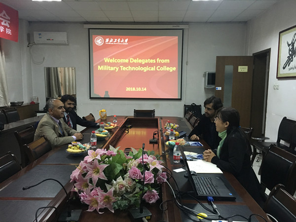 骞爱荣副院长对Abid Ali Khan教授一行的到访表示了热烈的欢迎,并向来宾介绍了我院的概况、特色专业。Abid Ali Khan教授介绍了阿曼军事技术学院的办学及研究特色。