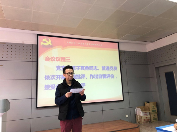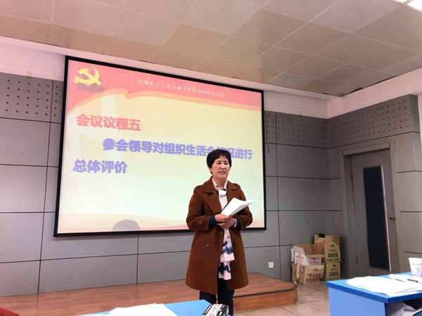 会议最后,学校党委组织部李彩香同志对本支部工作进行了总体评价,充分肯定了党支部在2018年党建方面取得的优异成绩。她指出,大多数党员能够按照党委要求做到批评与自我批评,特别是老党员发言积极,起到了党员模范带头作用。同时也提了三点建议:一是组织生活会作为政治生活的重要部分,要进一步精心组织,尤其是我系党支部作为标杆支部,组织生活会要以高标准要求,更有效发挥组织生活会的积极作用;二是基层党组织要充分发挥战斗堡垒作用,通过召开组织生活会要解决凝聚改革共识,提振集体的精神气;三是党支部工作要进一步与学校人才培养的发展相关联,重点在高层次师资的引进和学生培养两个方面做出更多的努力。学院党委书记唐玉生同志对本次会议给予了充分的肯定,希望支部在校党委和学院党委的领导下,在今后的工作中,紧密围绕深入学习贯彻党的十九大精神,牢固树立“四个意识”,坚定“四个自信”,加强思想政治引领,进一步提升支部工作水平。