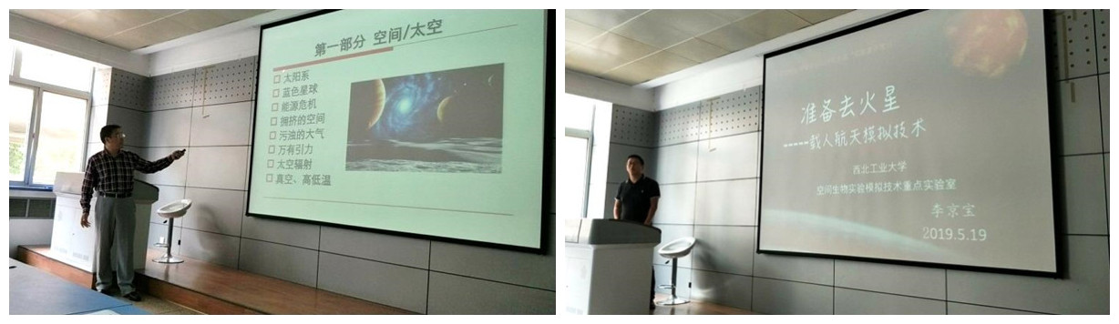 在科普报告环节,仓怀兴教授做了题为“空间环境与蛋白质结晶”的报告,通过大量的数据、图片,直观生动、深入浅出地向孩子们展示了空间科学的发展进程、面临问题以及实际应用等方面的知识。李京宝做了“准备去火星——载人航天模拟技术”的报告,通过形式新颖、引人入胜的讲解,激发了孩子们对于探索火星世界的浓厚兴趣。整个报告期间,同学们听得全神贯注。报告结束,同学们争先恐后地举手提问,面对孩子们提出的颇具科学思维的问题,两位教授认真地进行了一一解答。