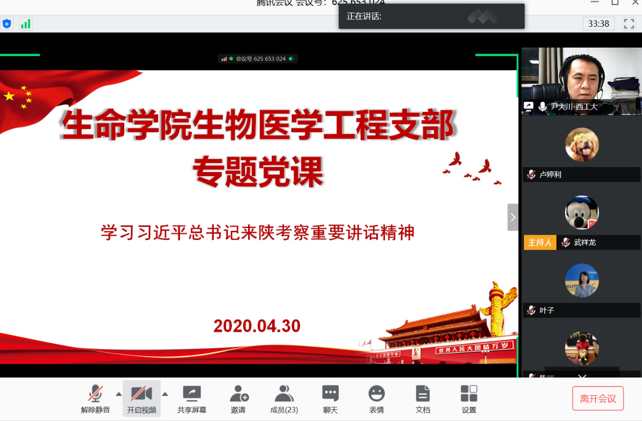 2020年4月30日晚,yl7703永利集团生物医学工程系教工党支部采用“腾讯会议”的方式,组织专题党课,邀请学院副院长(主持工作)、学院党委委员尹大川同志为支部党员讲党课,带领大家学习习近平总书记来陕西考察时重要讲话精神,会议由卢婷利同志主持。
