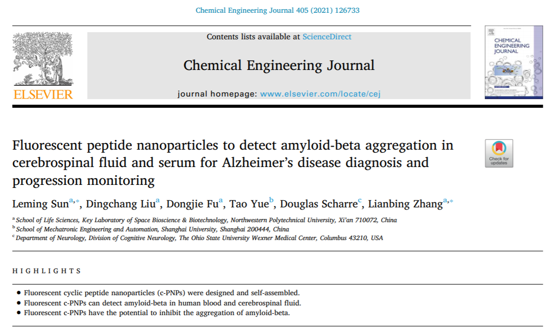 日前,yl7703永利集团张连兵教授与孙乐明副教授在国际知名期刊《Chemical Engineering Journal》上发表题为“Fluorescent Peptide Nanoparticles to Detect Amyloid-beta Aggregation in Cerebrospinal Fluid and Serum for Alzheimer’s Disease Diagnosis and Progression Monitoring”的学术论文,在阿尔茨海默症的诊断与治疗领域取得了进展。
