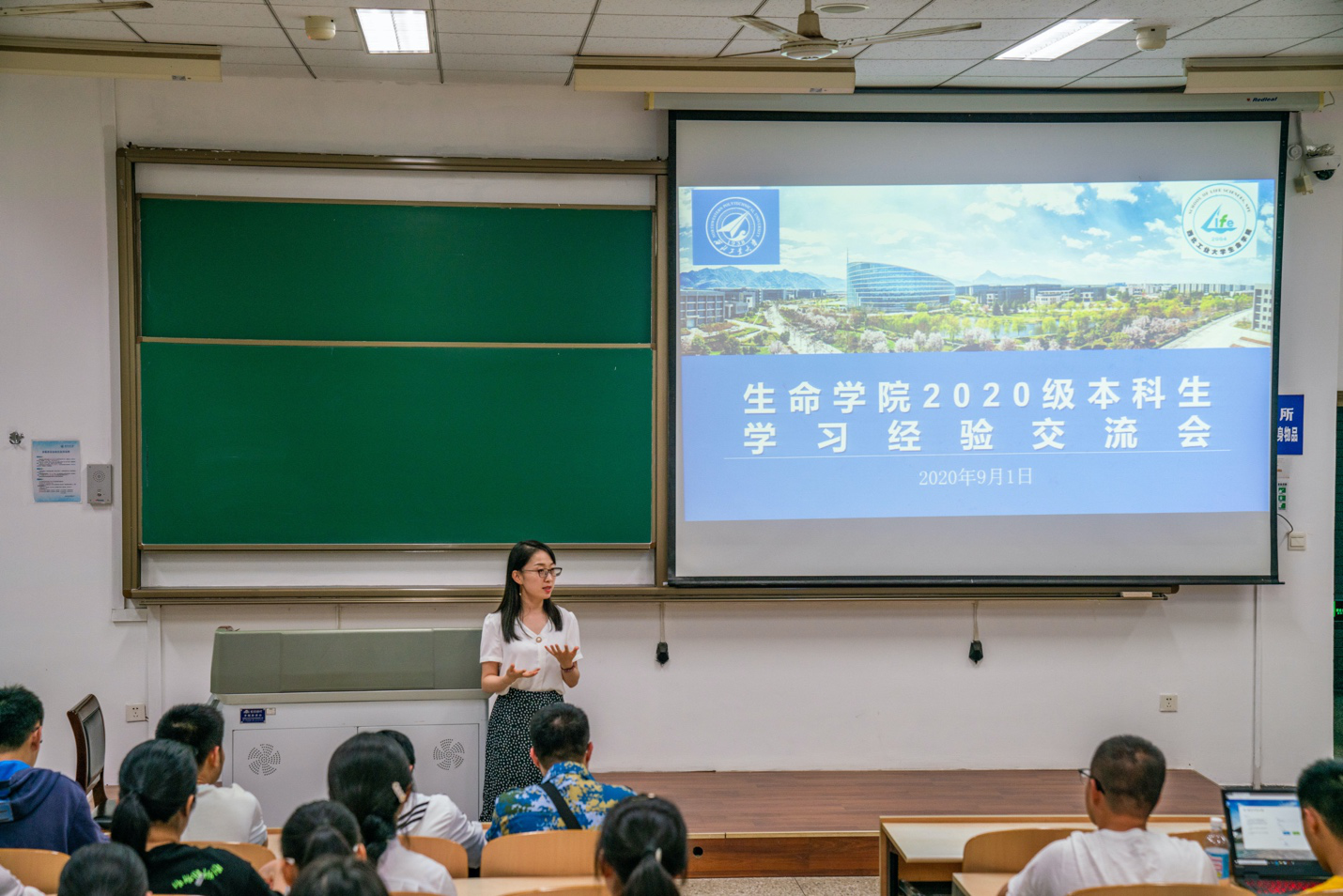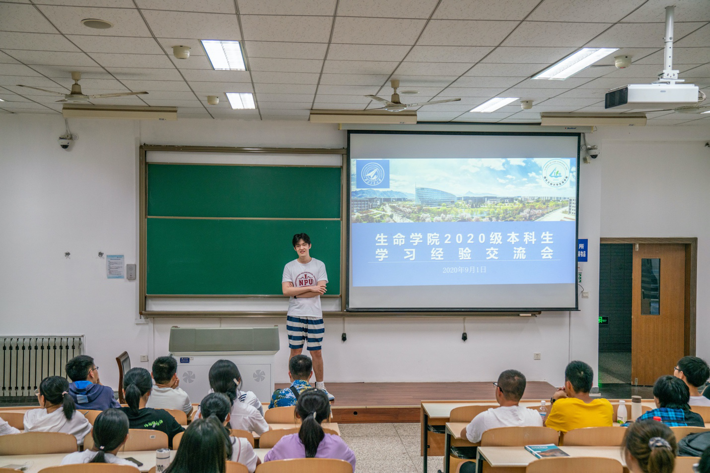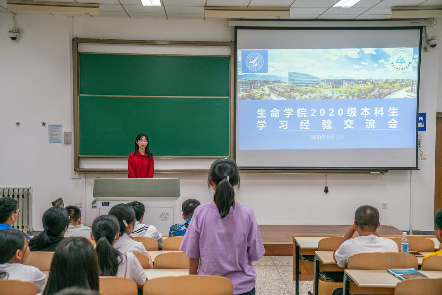 2017级李青阳提到了自己学习英语的经验,告诉大家,学习英语是一个潜移默化的过程,在全英文专业里学习,背单词不需要刻意记住,在平常的上课过程中就会逐渐适应。刘乾隆提到了自己一开始的理想专业是化学,但是通过一年的全英文生物技术专业的学习,他慢慢热爱上了这个专业,他鼓励2020级新生,要多了解生物专业,探索其中的奥秘。2018级张世龙讲解了提前进入实验室开始科研工作的重要性,并且分享了实验室工作、秦岭实习、以及去加拿大进行科研学习交流的照片,生动形象地讲述了自己对生物专业的认识和热爱。陈茁芊通过随机提问两位同学的大学和高中作息时间,引出了如何合理安排大学的作息时间,如何抓住大学四年宝贵的机会,并对全英文专业的优势进行了分析,包括小班研讨授课,老师能够精心辅导,以及对英语学习的促进等等。
