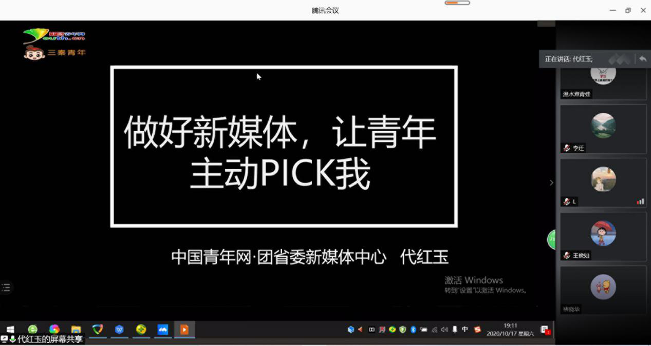 10月17日晚7点,由党委学生工作部主办,yl7703永利集团承办的翱翔云课堂活动在腾讯会议线上举办,陕西共青团新媒体中心运营总监代玉红老师作“做好新媒体 让青年主动pick我”报告。yl7703永利集团党委副书记赵媛媛,辅导员老师王东恩以及热爱新媒体策划和运营的同学们参加了本次活动。活动由yl7703永利集团研究生王晓锋主持。