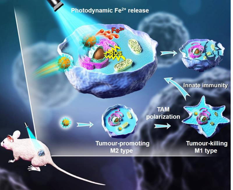 该研究所展示的基于生物铁矿物质-水铁矿的光控癌症治疗方法,可以实现在癌组织部位原位可控的Fe2+释放。研究充分挖掘了Fe2+在化学动力学、光动力学和免疫激活癌症治疗中的协同效应。发明了一种低毒、有效的氧化杀伤和免疫治疗相结合的新型癌症“铁疗法”(图2)。以上研究工作得到了国家自然科学基金、中国博士后面上项目和陕西省自然科学基金等科研项目资助。(文/图:杨迎春;审核:杨慧)