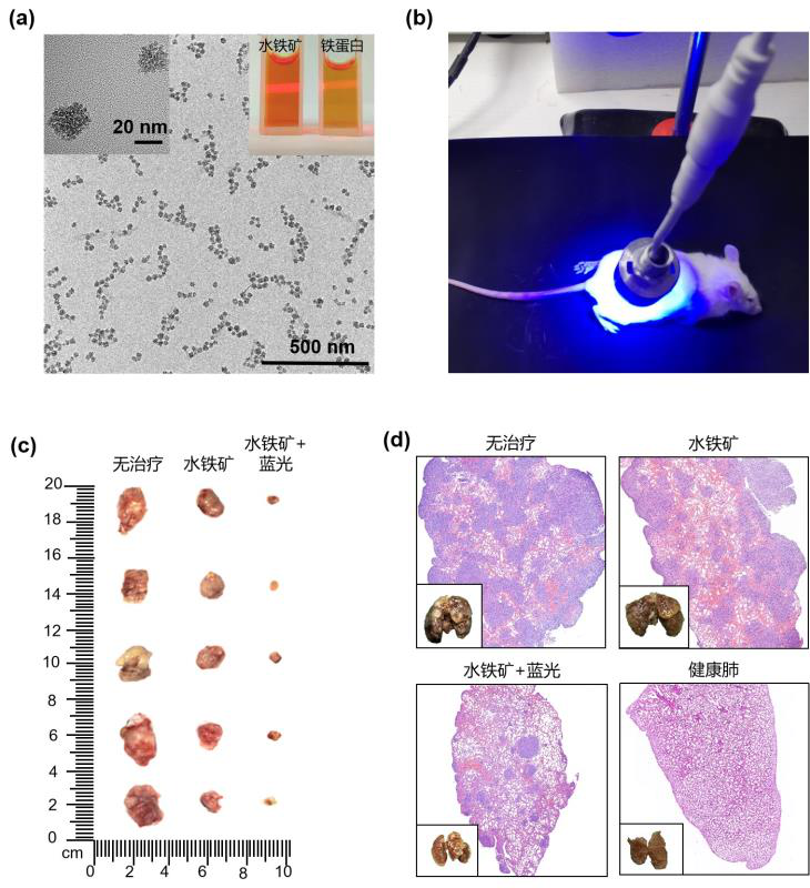 图1.(a)水铁矿纳米颗粒的透射电镜图;(b)小鼠肿瘤治疗过程;水铁矿-蓝光系统(c)杀伤肿瘤和(d)抑制肿瘤转移的效果。