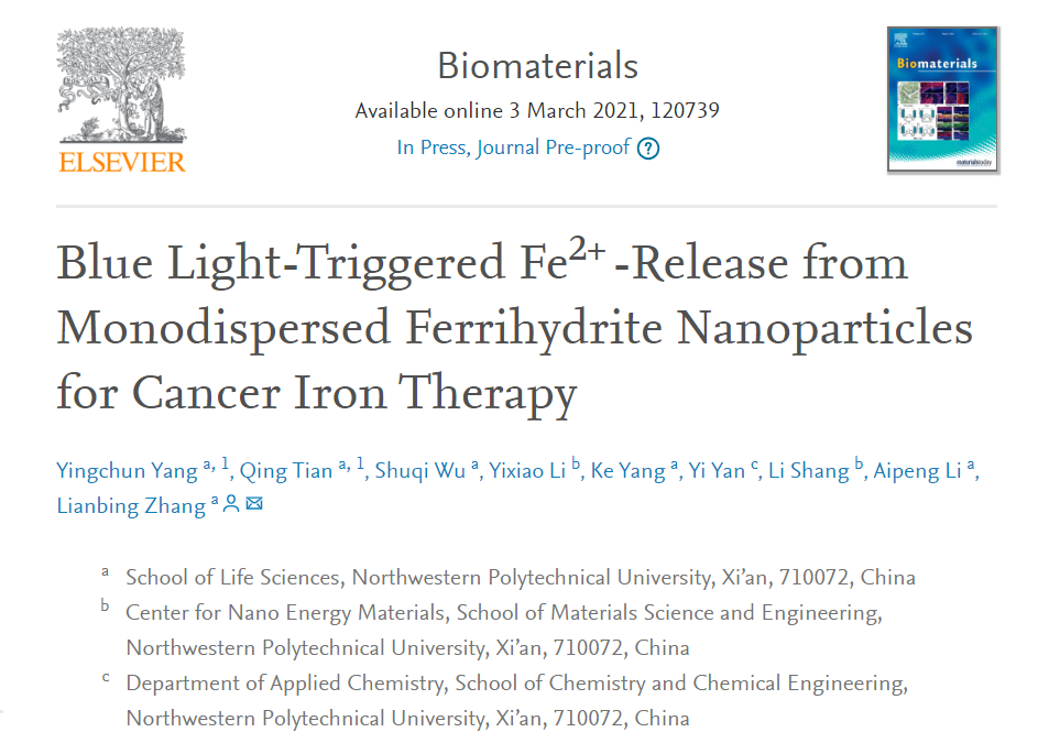 近日,以yl7703永利集团为第一完成单位和通讯单位的研究成果Blue Light-Triggered Fe2+-Release from Monodispersed Ferrihydrite Nanoparticles for Cancer Iron Therapy在线发表于生物材料领域顶级期刊Biomaterials上(DOI:10.1016/j.biomaterials.2021.120739,IF:10.317)。博士研究生杨迎春、田庆为该论文的共同第一作者,张连兵教授是该论文的通讯作者。