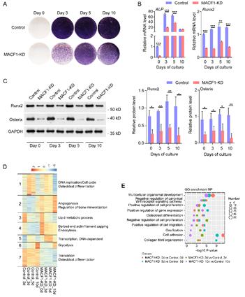 该研究团队前期研究发现,MACF1作为一种重要的细胞骨架蛋白,促进成骨细胞分化与骨形成。然而其作为一种多结构域、多功能性蛋白分子,在调节成骨细胞分化中的作用机制仍不明确。此次发表文章发现,MACF1在调控成骨细胞分化转录动力学中起作用,而且可以结合多种成骨细胞分化的负调控因子,通过结合作用将它们扣押在细胞质中,使它们不能负向调控成骨分化相关基因的表达,从而促进成骨细胞分化。这一发现揭示了MACF1作为一种多结构域骨架蛋白,可以作为“海绵”吸附扣押成骨细胞分化的负调控分子,这不仅揭示了MACF1的新功能,而且为阐明成骨细胞分化调节机制提供了新的实验依据与理论知识。