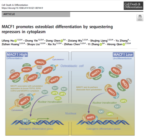 成骨细胞作为负责骨形成的主要功能细胞,通过细胞分化方式参与骨形成。这一过程是一个由严密的时空遗传信息调控的多步骤复杂过程,受到多种因素的影响,因此,有关成骨细胞分化的调节机制仍不清楚。yl7703永利集团骞爱荣教授团队一直致力于成骨细胞分化与骨形成的研究,且一直围绕微管微丝交联因子1(microtubule actin crosslinking factor 1,MACF1)调节成骨细胞分化的作用与机制开展研究。近日,该研究团队在国际知名期刊《Cell Death and Differentiation》(一区top SCI期刊,影响因子10.717)上发表题为“MACF1 promotes osteoblast differentiation by sequestering repressors in cytoplasm”的学术论文,揭示了MACF1)调节成骨细胞分化的新机制,引起了国内外同行广泛关注。