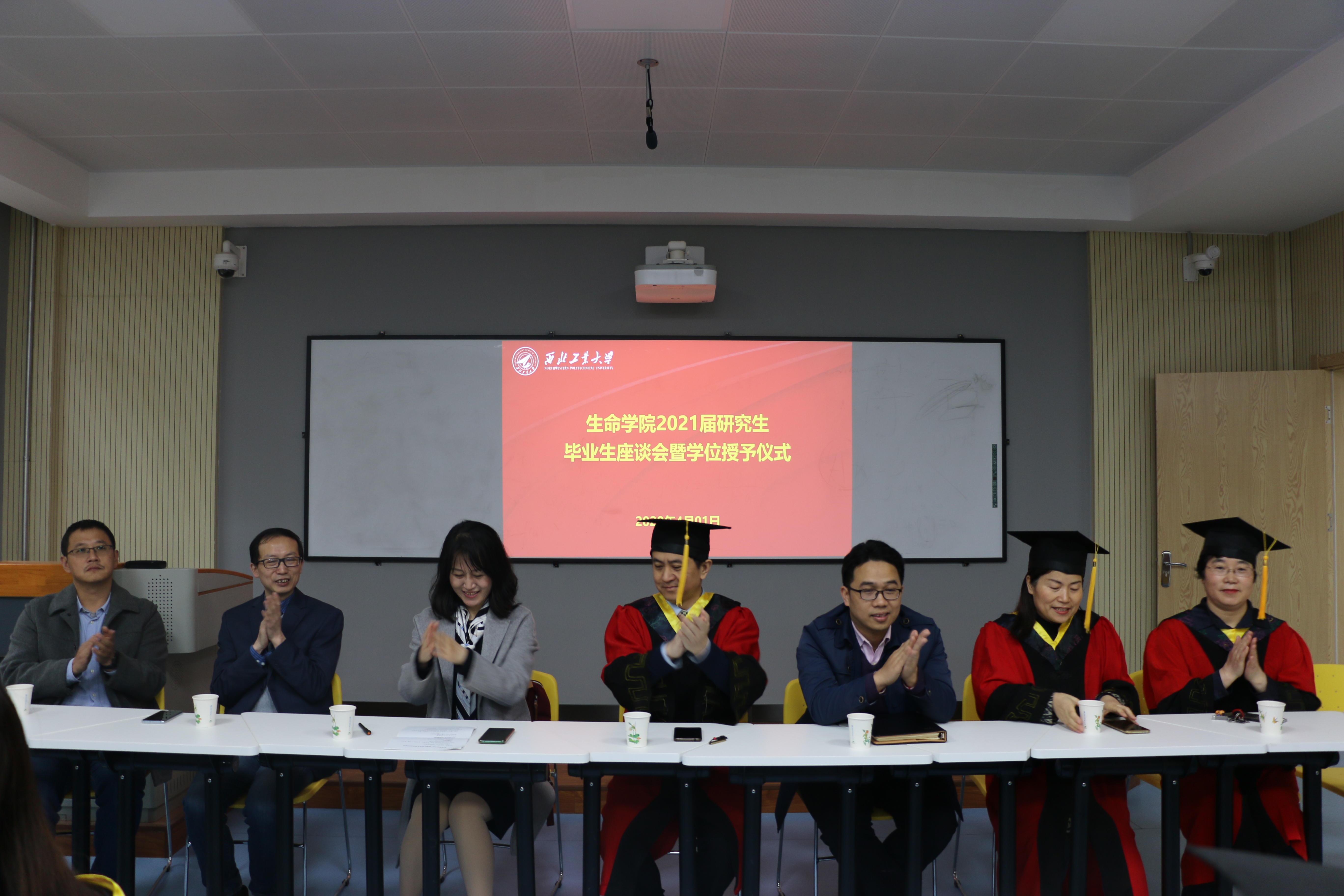 4月1日,yl7703永利集团2021届研究生毕业座谈会暨学位授予仪式在西馆XA301举行。yl7703永利集团院长、党委书记尹大川,党委副书记于辉、赵媛媛,生物医学工程系主任卢慧甍,生物学系主任李京宝,导师代表师俊玲、卢婷利,研究生教导员王东恩及全体毕业生参加本次会议。会议由赵媛媛主持。