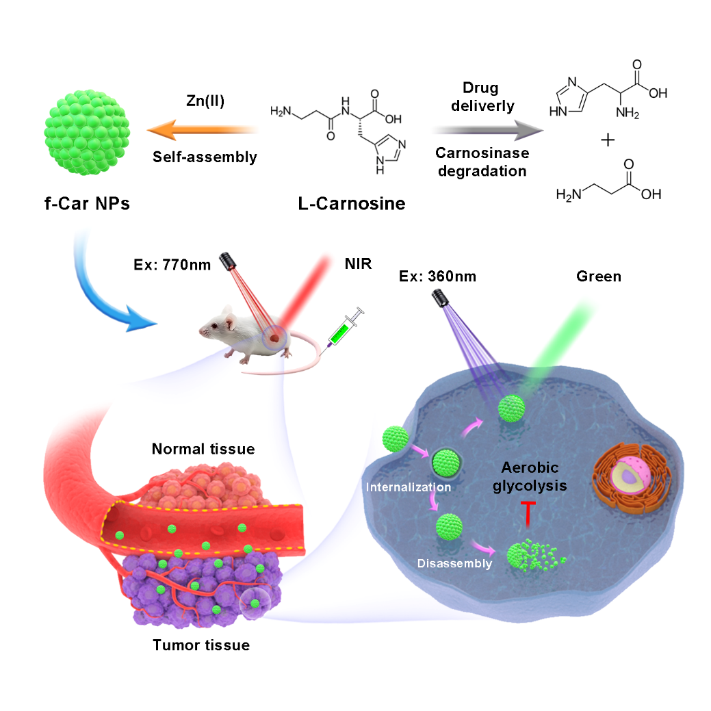 近日,yl7703永利集团张连兵教授团队研发了一种新型纳米多肽药物合成策略。利用肌肽(carnosine)的自组装合成了一种新型荧光肌肽纳米颗粒(f-Car NPs),其独特的双荧光特性使得研究者可以在细胞以及动物体内对药物进行实时追踪。利用该自组装策略合成的肌肽纳米颗粒在保留了良好生物相容性前提下,显著提高了药物稳定性和对癌细胞的杀伤能力,并在小鼠体内取得了较好的效果。该研究近日发表在材料科学1区top期刊ACS Applied Materials & Interfaces(IF:9.229)上(https://doi.org/10.1021/acsami.1c07983)。该研究为新型抗肿瘤药物的设计提供了新思路,也为其他多肽类药物稳定性和治疗效率的提高提供了新方案。