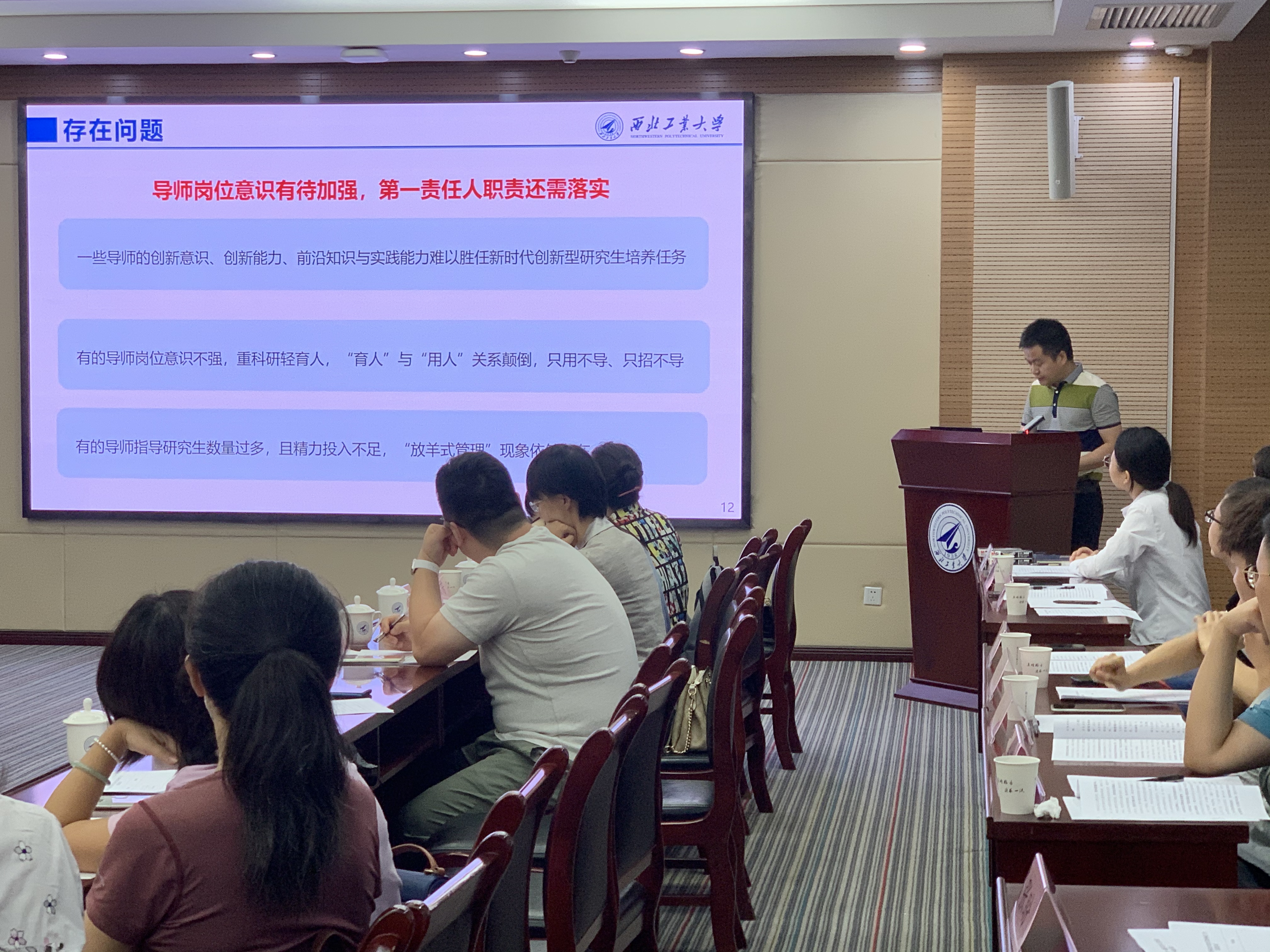 会议第二项议程由王鹏副院长对加强研究生导师岗位管理工作举措进行汇报,围绕学校已落实的事项和目前仍存在的问题展开,对导师遴选、招生和明确导师变更程序机制等方面进行了详细阐述,并提出了今后改革的具体举措。