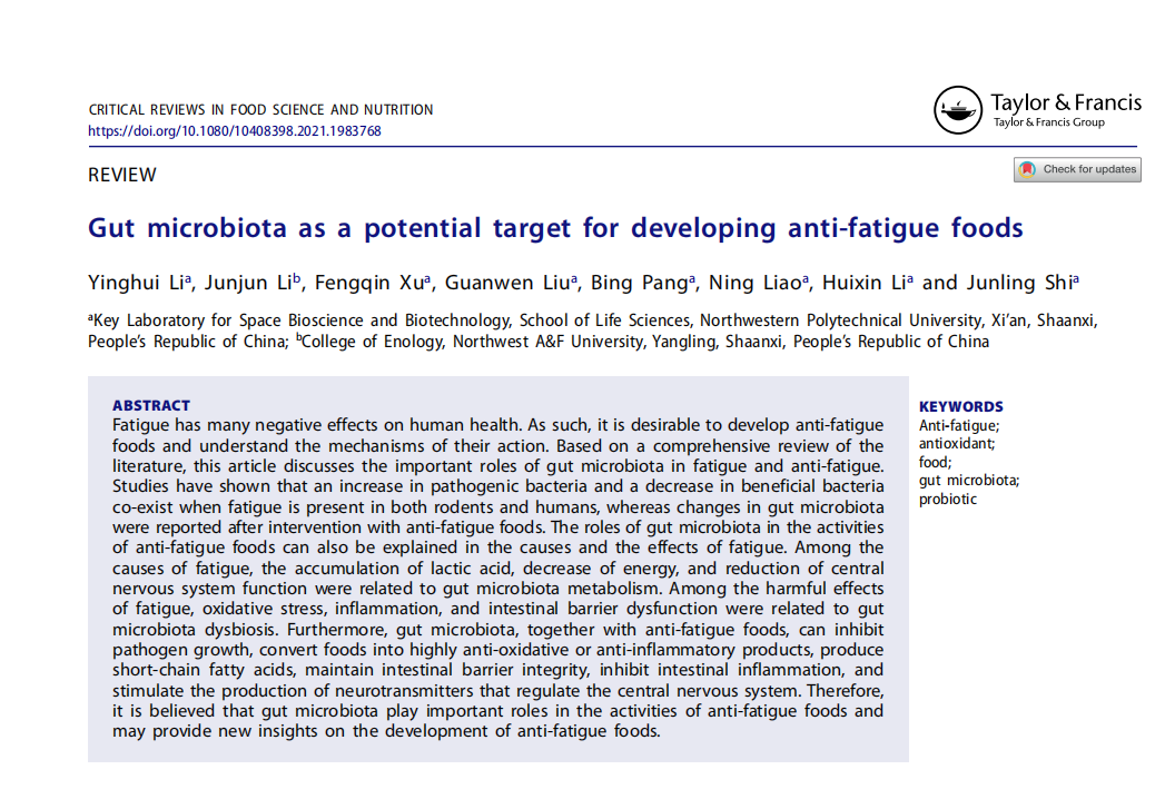 近日,我院硕士研究生李颖慧在食品领域顶级期刊(Critical Reviews in Food Science and Nutrition,中科院一区,IF=11.176,食品领域排名第四,年发文量261篇)发表题为“Gut microbiota as a potential target for developing anti-fatigue foods”的综述性文章。通讯作者为师俊玲教授。师俊玲教授团队主要从事肠道菌群与人体健康方面的研究工作,在开益生菌预防与治疗肠道与代谢性疾病方面进行了大量的研究工作,旨在为开发具有我国自主知识产权的特效性益生菌菌株奠定理论基础。