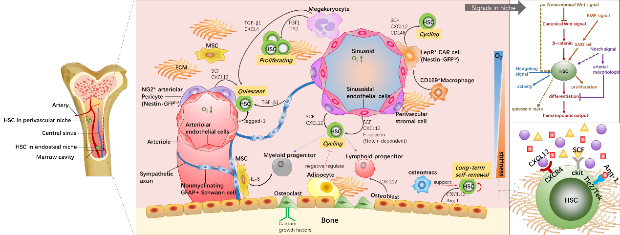 图1 骨髓微环境内部多种理化信号与造血干细胞相互作用