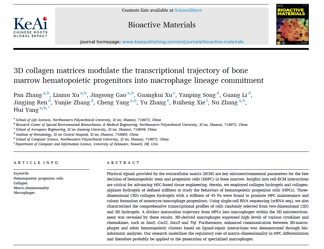近日,我院博士研究生张盼在生物材料领域顶级期刊(Bioactive Materials,中科院一区,IF=14.593,生物材料领域排名第一,年发文量104篇)发表题为“3D collagen matrices modulate the transcriptional trajectory of bone marrow hematopoietic progenitors into macrophage lineage commitment”的研究性文章。通讯作者为杨慧教授。细胞微环境体外构建及造血干细胞力学生物学是杨慧教授团队的主要研究方向之一,旨在利用力学、生物学、医学、材料学等领域的交叉融合,为免疫细胞的临床应用开发奠定基础。