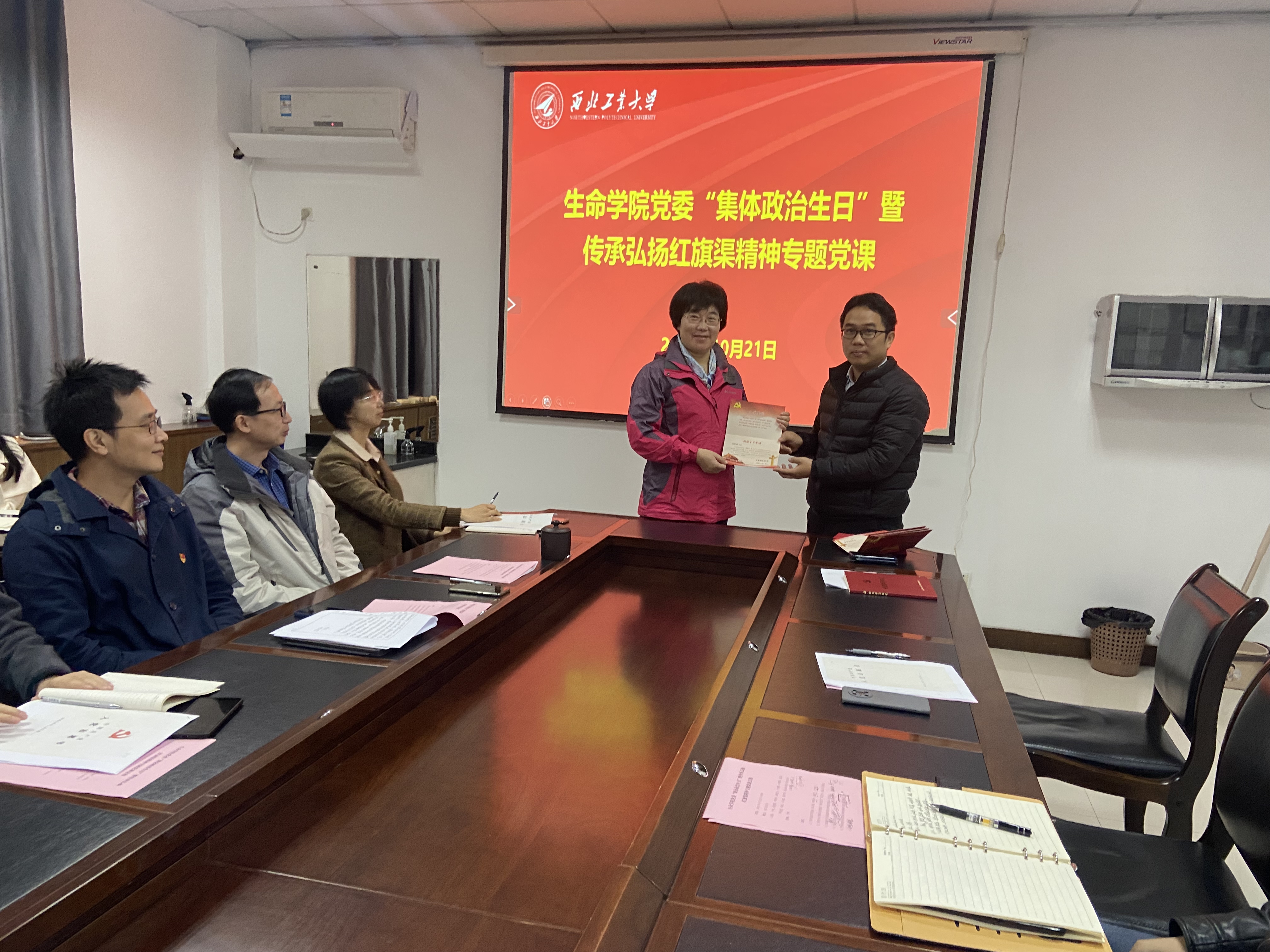 于辉代表学院党委为十名党员送上“政治生日”纪念卡。