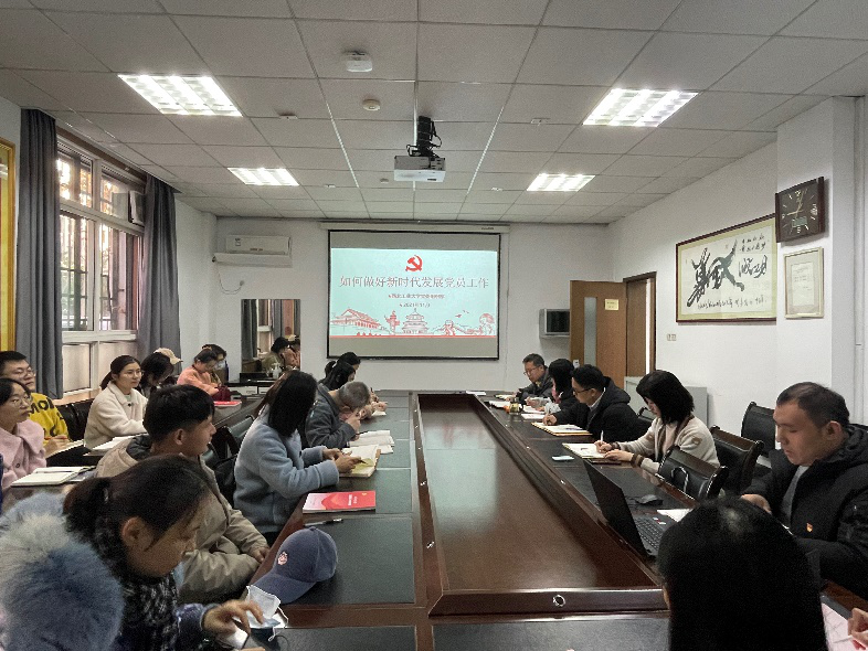学院邀请党委组织部王一宁同志做专题培训。王一宁围绕“如何做好新时代发展党员工作”主题,从发展党员工作的重要意义、程序要求、注意问题、相关思考等四个方面开展培训。他讲到,做好新形势下发展党员工作,一是要做到工作“讲民主”,推选接收“有广度”;二是要做到程序“讲原则”,对标对准“有精度”;三是要做到教育“讲方法”,引导培育“有深度”。