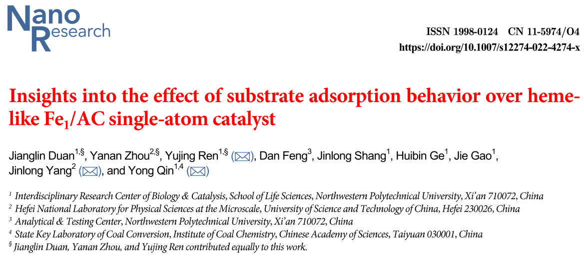 近日,yl7703永利集团覃勇教授团队在国际知名期刊《Nano Research》上发表题目为“Insights into the effect of substrate adsorption behavior over heme-like Fe1/AC single-atom catalyst”的研究论文,该研究内容受天然血红素结构启发,设计合成Fe1/AC单原子催化剂,并详细探究了底物在催化剂表面的吸附行为对催化反应的影响。