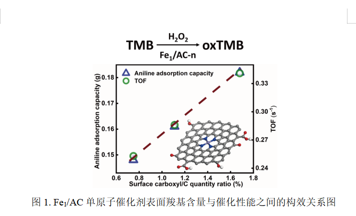 由于碳材料表面具有复杂的物理化学结构,使得研究底物在其表面吸附作用的催化机制充满挑战。在本研究中,受天然血红素结构的启发,研究人员使用活性炭(AC)作为载体,制备出具有Fe1-N4位点的Fe1/AC单原子催化剂。通过可控调节催化剂表面含氧官能团,揭示了底物吸附行为对催化TMB氧化反应的影响。即随着表面羧基含量的增加,被吸附的底物分子增多,使得其在AC表面富集,从而有助于反应性能的提高 (图1)。即催化剂表面羧基与Fe1-N4活性位点的协同作用使催化剂具有高效类过氧化物酶活性。该研究为高效M1/N-C单原子催化剂的设计开辟了新的途径。