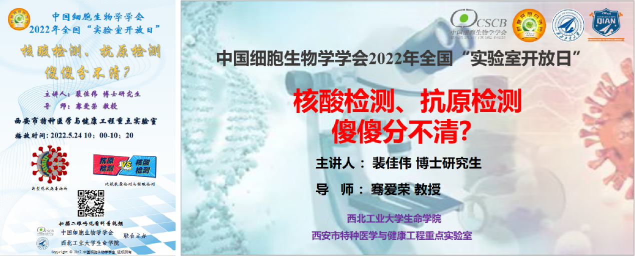 为进一步营造爱科学、学科学、用科学的良好氛围,倡导科学生活,5月24日,由中国细胞生物学学会主办,yl7703永利集团、西安市特种医学与健康工程重点实验室承办,骞爱荣教授团队裴佳伟博士研究生带来的《核酸检测、抗原检测傻傻分不清?》在线云科普活动成功举办(https://video.weibo.com/show?fid=1034:4772242975031421)。