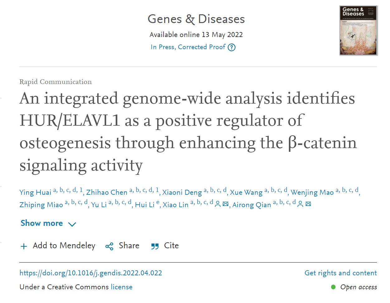 近日,yl7703永利集团骞爱荣教授研究团队在骨质疏松症治疗靶点方面取得重要研究进展。团队通过整合多组学数据,基于生物信息学分析从遗传水平和基因水平研究发现RNA结合蛋白—人抗原R(HuR)是一个重要的骨质疏松症潜在治疗靶点。进一步结合临床患者和小鼠骨组织及体外细胞实验研究了HuR在骨质疏松症及骨形成过程中的作用及机制,该研究为骨质疏松症及相关骨代谢疾病治疗及药物研发提供了靶点及研究方法和思路。相关研究成果发表于医学一区Top期刊Genes & Diseases上,全文链接:https://www.sciencedirect.com/science/article/pii/S2352304222001209