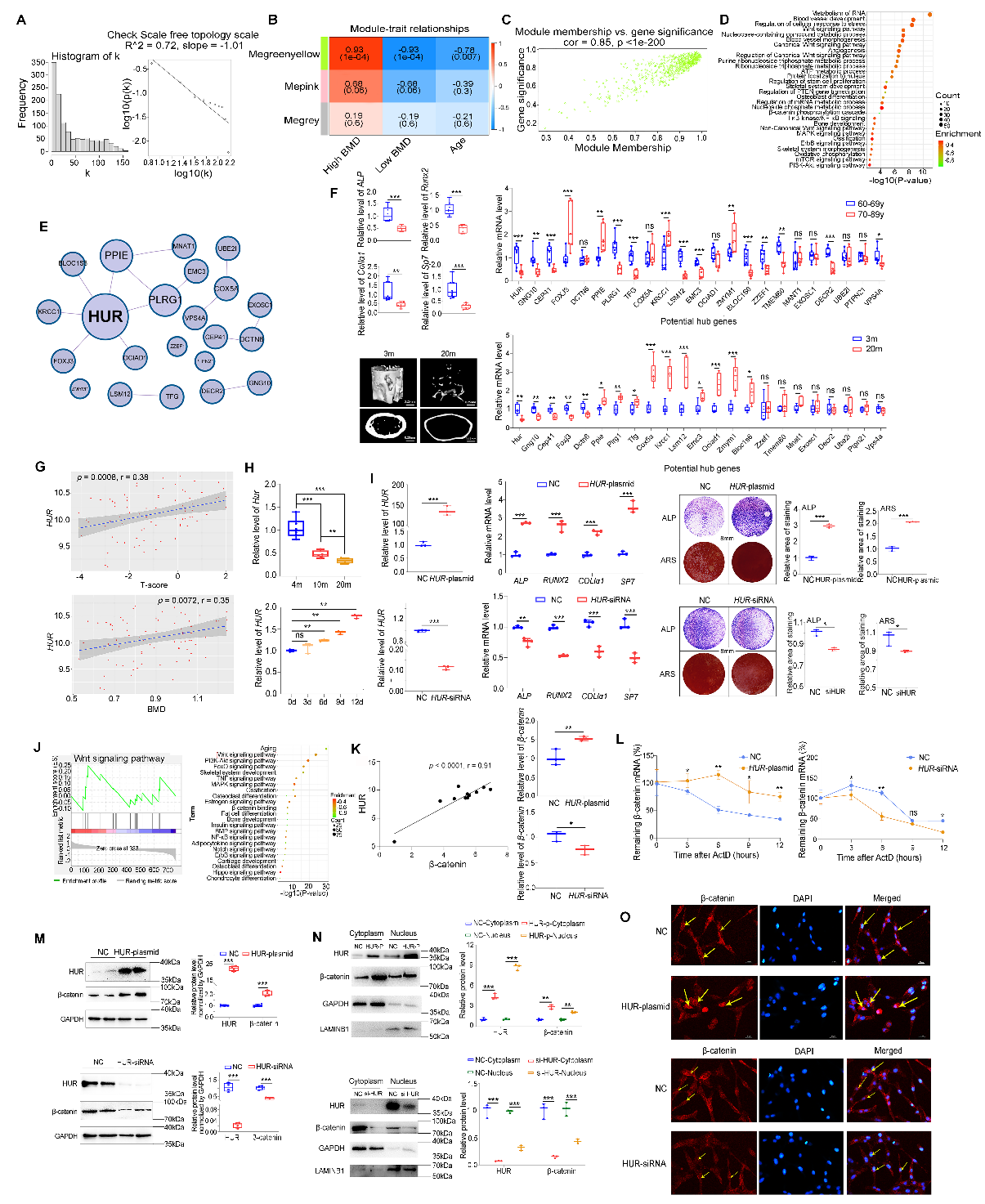 本研究中作者整合多组学数据,借助权重基因共表达网络分析方法,从系统生物学角度筛选与骨质疏松症相关的潜在核心基因,并结合临床患者和小鼠骨组织进行进一步筛选和鉴定,最终确定人抗原R(HuR)是一个重要的骨质疏松症潜在治疗靶点。接着,我们通过体内外实验研究了HuR在骨质疏松症发生和骨形成过程中的作用和机制,发现HuR是一个重要的成骨分化正调控因子,通过调控Wnt/β-catenin信号通路,促进β-catenin的mRNA稳定性和核易位来促进成骨分化过程。本研究将生物信息学与生物学实验干湿结合,从上游筛选到下游鉴定及功能机制研究,首次揭示了HuR作为成骨分化正调控因子在骨形成过程中的重要作用及机制,为骨质疏松症治疗及药物研发提供了靶点,为骨代谢及相关疾病靶点的挖掘及分子机制研究提供了新方法和新思路。