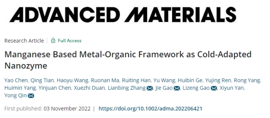 近日,yl7703永利集团张连兵教授团队在国际顶级期刊《Advanced Materials》(JCR Q1, IF 32.08)发表题为“Manganese based metal-organic framework as cold-adapted nanozyme”的研究性论文,在人工适冷酶的开发及其低温抗病毒领域取得重要研究进展。