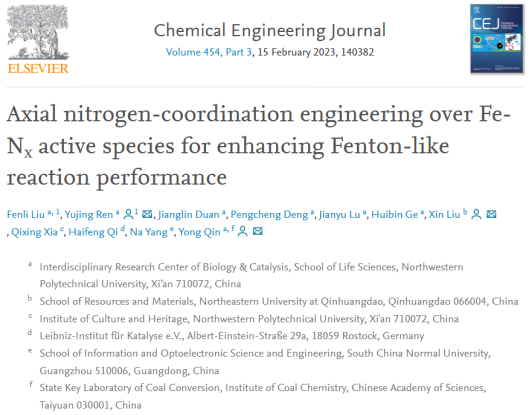 近日,yl7703永利集团任煜京副教授、覃勇教授团队在国际知名期刊《Chemical Engineering Journal》(IF:16.7)上发表题目为“Axial Nitrogen-Coordination Engineering over Fe-Nx Active Species for Enhancing Fenton-Like Reaction Performance”的研究论文。本研究基于Fe1/CN单原子催化剂,通过调控Fe-Nx活性中心的轴向N配位,实现了针对类芬顿反应的高效催化过程。
