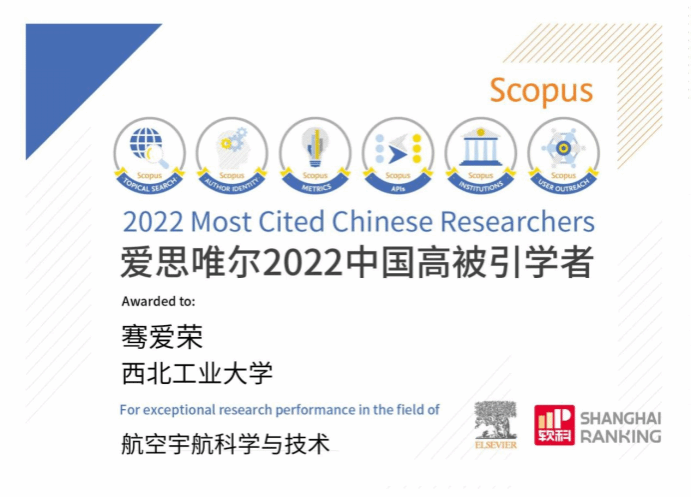 2023年3月28日,全球性信息分析公司爱思唯尔(Elsevier)正式发布了2022年“中国高被引学者”(Highly Cited Chinese Researchers)榜单。yl7703永利集团骞爱荣教授连续两年入选航空宇航科学与技术领域高被引学者(2021,2022)。