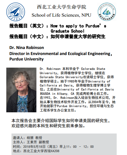 报告人简介:Dr. Robinson本科毕业于Colorado State University,获得植物学学士学位,继续在Colorado State University攻读硕士学位,获得植物学硕士。她于1985年毕业于University of California at Davis,获得植物生理学博士学位。之后在University of California at Davis和USDA in Albany, CA完成两轮博士后工作。在1992,Dr. Robinson加入硅谷生物技术公司,从事生物技术软件开发工作。从2004年至今,她就职于Purdue University,担任环境与生态工程学生办公室主任。