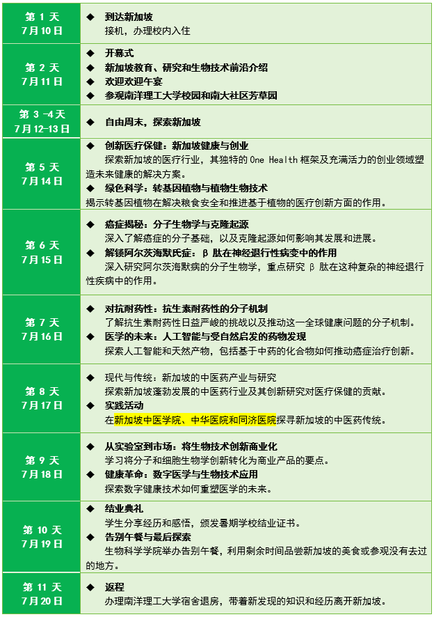 1.前沿讲座:通过系列前沿讲座探索新加坡的生物科技生态系统及其全球影响、深入了解人工智能在药物发现中的作用、探索中国传统医学如何与现代科学相结合。