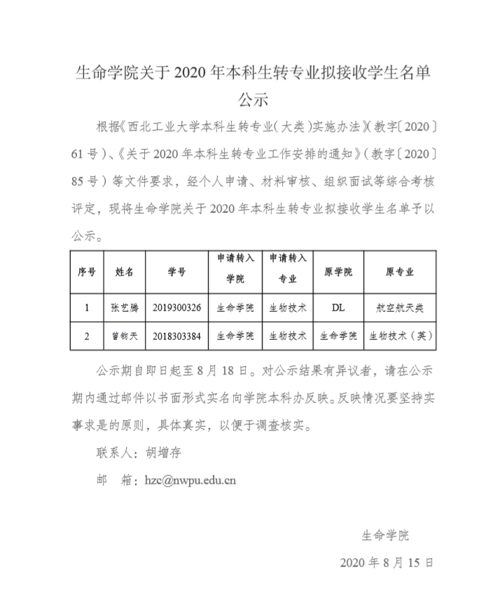 yl7703永利集团关于2020年本科生转专业拟接收学生名单公示